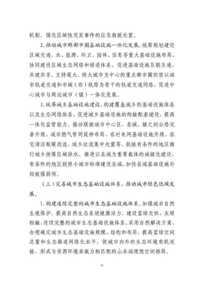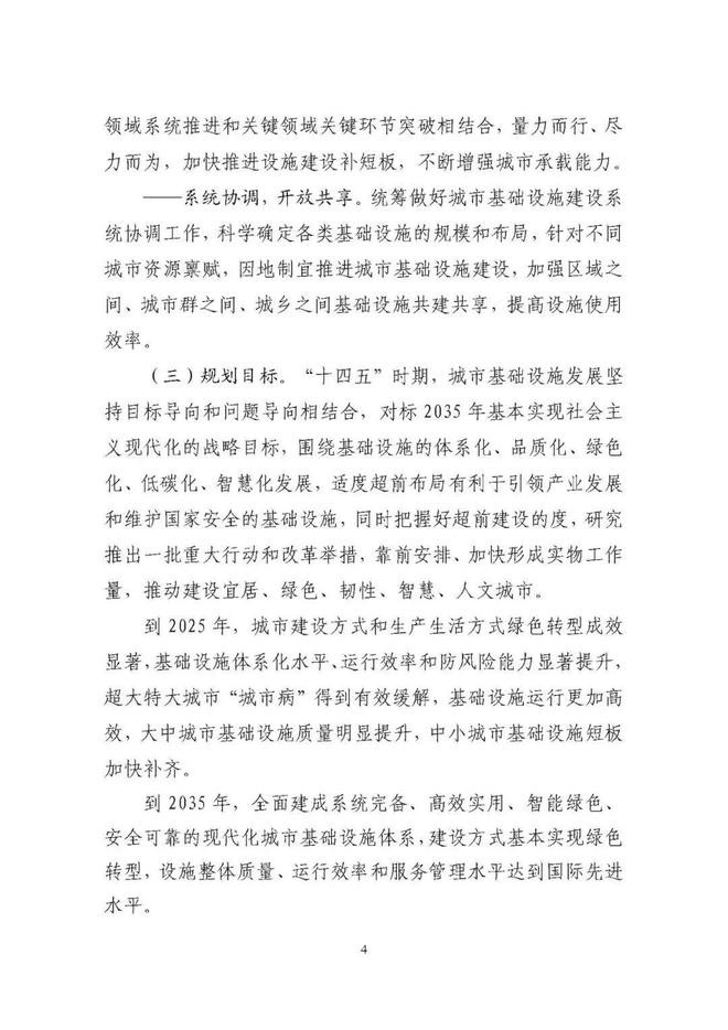 《规划》围绕构建系统完备、高效实用、智能绿色、安全可靠的现代化基础设施体系,提出4方面重点任务。一是推进城市基础设施体系化建设,增强城市安全韧性能力。二是推动城市基础设施共建共享,促进形成区域与城乡协调发展新格局。三是完善城市生态基础设施体系,推动城市绿色低碳发展。四是加快新型城市基础设施建设,推进城市智慧化转型发展。