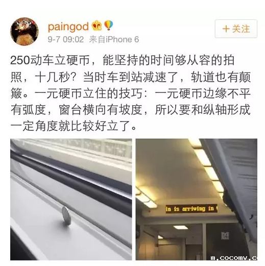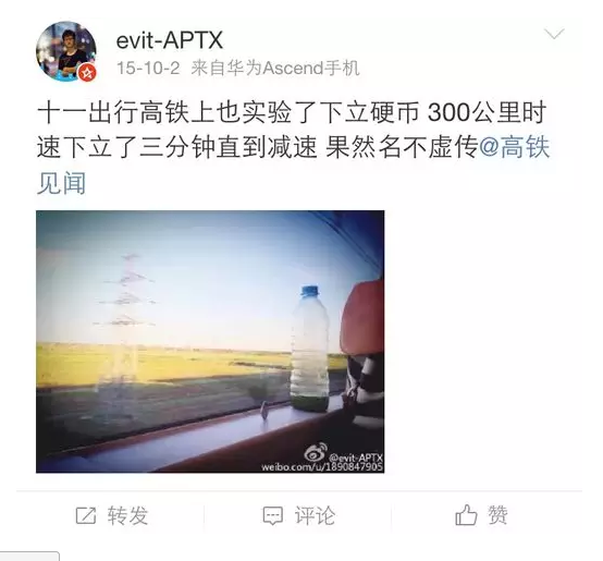 各路中国网友开始踊跃证明,用一元硬币在高铁上做起了立硬币实验(一元人民币厚度是1.85毫米),结果硬币依然傲然挺立,表示毫无压力。