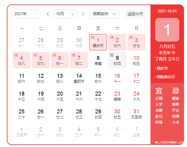 1、10月1日至7日放假调休,共7天。9月26日(星期日)、10月9日(星期六)上班。