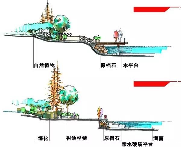 驳岸的植物配置很重要,既能使岸上的景色和水融为一体,又对水面空间的景观起着主导的作用。驳岸一般分为土岸,石岸,混凝土岸等等,自然的或规则的。