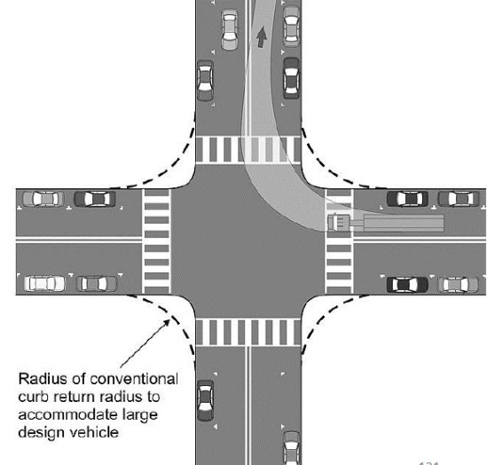 车辆转弯都会形成内轮差和外轮差,对其他用路人形成威胁。因此,在小半径转弯中,应对该交叉口的所有用路人进行流线分析,并据此形成必要的隔离和控制,确保安全。在美国的规范里,交叉口的转弯半径,即便直角也是可行的,但要有一大堆方法解决不同用路人的转弯。如果仅仅缩小转弯半径,而没有针对用路人做必要转弯流线优化,并有必要的控制措施,会极大的增加风险,并降低交叉口的容量。因此,形成小半径弯道,不在于弯道半径是多少,而在于如何确保安全和容量。图片来源:徐耀赐/交叉口设计