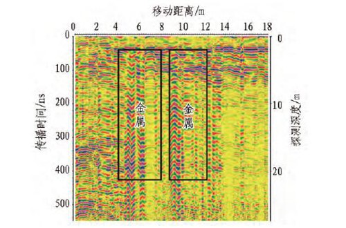 雷达天线位置与探测表面之间存在一定距离,电磁波传播至地面反射回来被接收形成直达波。为了将探测深度坐标轴原点建立在地面,使异常体深度为雷达图像深度坐标值,在数据处理时需将直达波时间段剔除。直达波时间段切除准确与否会影响异常体的定位,尤其是在采用高频率雷达探测时,探测距离短,切除不准确对不良地质体位置的判断偏差更大,正确选取直达波时间更为重要。在现场探测时,可以预先在地表放一块金属物体,移动天线越过金属物体来获取直达波在雷达图像上的位置,随后移走金属物体再进行正式探测。数据处理时,通过分析越过金属物体的雷达数据来确定直达波时间。
