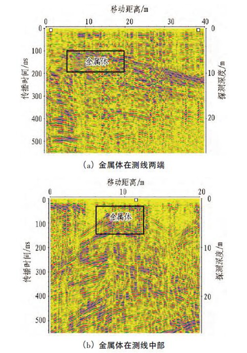 在进行底板探测时,测线附近通常放置有金属体( 如台车、装载机、电机等) ,会对探测结果产生干扰。当金属体位于测线两端时,其在雷达图像上反映为双曲线的一翼,如图7( a) 所示; 当金属体位于测线中间时,其在雷达图像上反映为双曲线,如图7 ( b) 所示。由于双曲线通常为溶洞在雷达图像上的反射特征,为防止将金属体误判为溶洞等异常体,探测前需撤走测线附近的金属体。