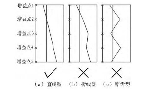 地质雷达探测时,电磁波由探测面向远处传播,部分能量会被介质吸收掉,反射波能量相应减少。距离天线越近反射波能量越大,距离天线越远反射波能量越小,会在雷达图像上反映出比较明显的能量分层带,越靠近探测表面信号越强,远端信号较弱,因此,需要进行增益调节来放大有效信号。正确的增益调节方式如图8( a) 所示。增益调节的原则是保证增益点之间线性变化,同时应使反射能量控制在一定的范围。增益太大会造成削波现象,掩盖有效信号,增益太小有效信号不明显,异常体位置不突出[14]。应根据隧道的实际情况,将天线移至探测位置,采用先自动后手动的方法调节增益。