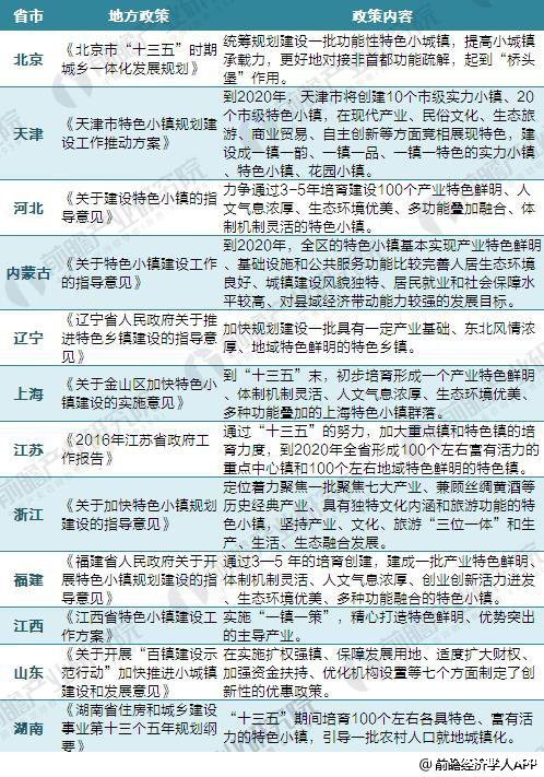 各地方政府也不断出台政策对特色小镇建设进行了规划,并初步设定了建设目标,同时出台了配套政策支持建设的推进。目前,浙江、北京、上海、贵州、福建、陕西、广东、天津、重庆、甘肃、江苏、四川等地已出台相关政策,预计会有更多的地区出台政策推动特色小镇的建设。