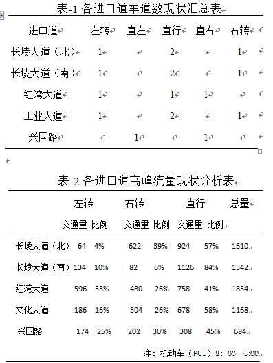 该交叉口各进口道车道设置和流量现状表-1和表-2所示。由表-2可知,长堎大道和红湾大道交通流量较大。实际调查中大中型车辆所占比例达到30%左右均集中在长堎大道和红湾大道。