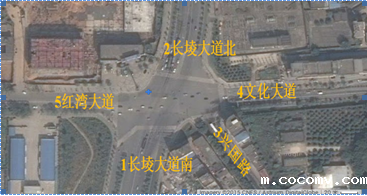 该交叉口位于江西省南昌市新建区中心城区西部。由长堎大道、红湾大道、文化大道、兴国路五路交叉组成。其中长堎大道南北方向双向六车道主干道,红湾大道、文化大道是连接新建区和湾里区的主要交通干道,兴国路连接新建区中心城区并设有多条公交线路。该交叉处在新建区大力开发地段,周边居民区密集、各道路沿途设有多家商业和购物中心,并辐射周边的高校园区和工业园区。由于交叉口交通流量较大、多路相交,加上长堎大道建成通车后未能对交叉口各进出口道和内部空间进行科学合理的交通渠化设计,导致交通混行,交通拥堵现象经常发生。交叉口现状如图-1所示。