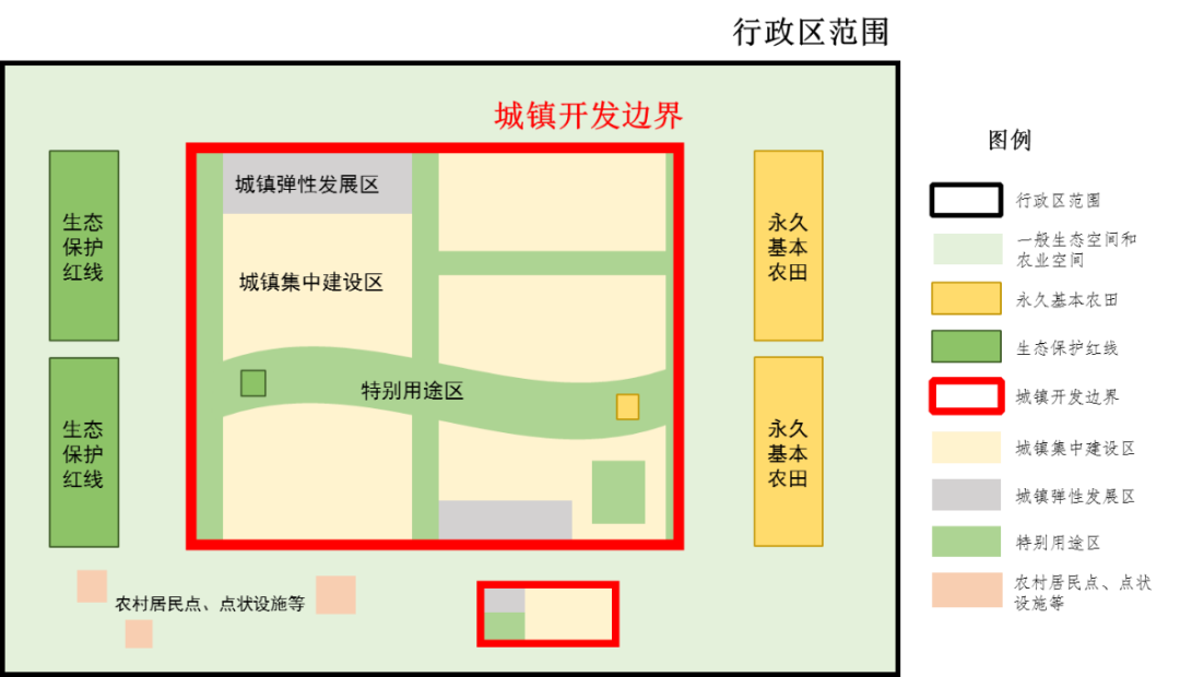城镇开发边界是在国土空间规划中划定的,一定时期内因城镇发展需要,可以集中进行城镇开发建设,完善城镇功能、提升空间品质的区域边界,涉及城市、建制镇以及各类开发区等。城镇开发边界内可分为城镇集中建设区、城镇弹性发展区和特别用途区(空间关系详见图1)。城市、建制镇应划定城镇开发边界。