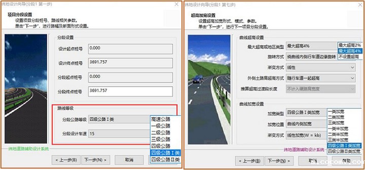 纬地软件加宽设计功能4、集成了完整的公路设计规范指标纬地软件支持用户自定义各等级技术指标,用户可根据需要,对技术标准库进行编辑与扩充。针对《小交通量农村公路工程技术标准》,纬地软件已于该标准发布第一时间,进行了研习,并集成了相关技术指标,用户可根据项目等级,直接选择小交通量道路等级,并由软件,自动完成路幅宽度、断面形式提取,超高加宽等自动计算。