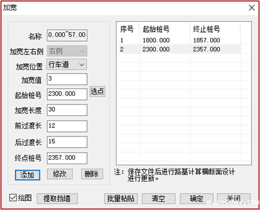 纬地软件实现任意复杂线形设计3、批量设计错车道和断面宽度变化针对低等级公路需要添加的错车道数量较多或者设置护栏时土路肩需要加宽的情况,纬地软件增加了快速加宽设计功能。可根据加宽需求设置加宽名称、加宽位置(含行车道、硬路肩、土路肩)、加宽值、加宽起终点桩号、加宽长度、过渡段长度等参数,也可直接提取该项目的挡墙设置段落进行加宽设计。